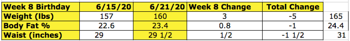 I finished the week with one more cheat meal but worth every bite. I only cheat when its worth it and this 5 star dinner was worth it. I practiced kindness and accepted my weight may fluctuate because of the hormone changes during higher carb meals this week. The great thing is when we fall we can always get back up. Our self talk after plays a huge role here. I could put myself down and decide to give up or keep going and eventually get to my goal? Writing things down helps me get a better perspective to what the better decision is. And also seeing my measurements. Here is this weeks weigh in!